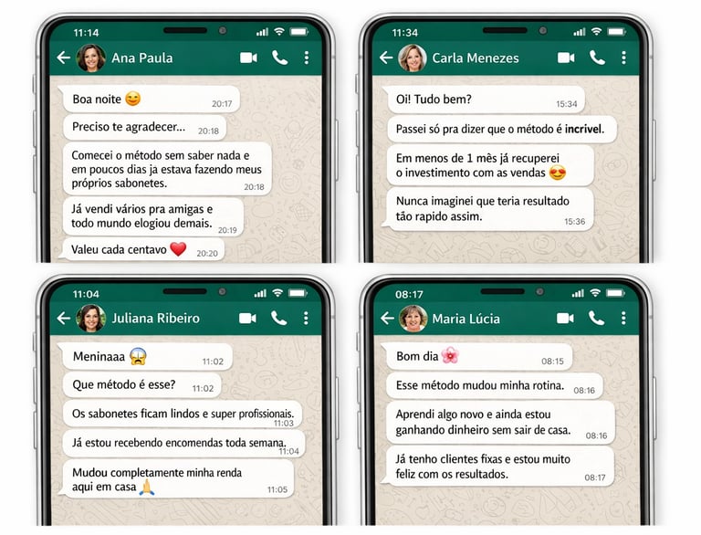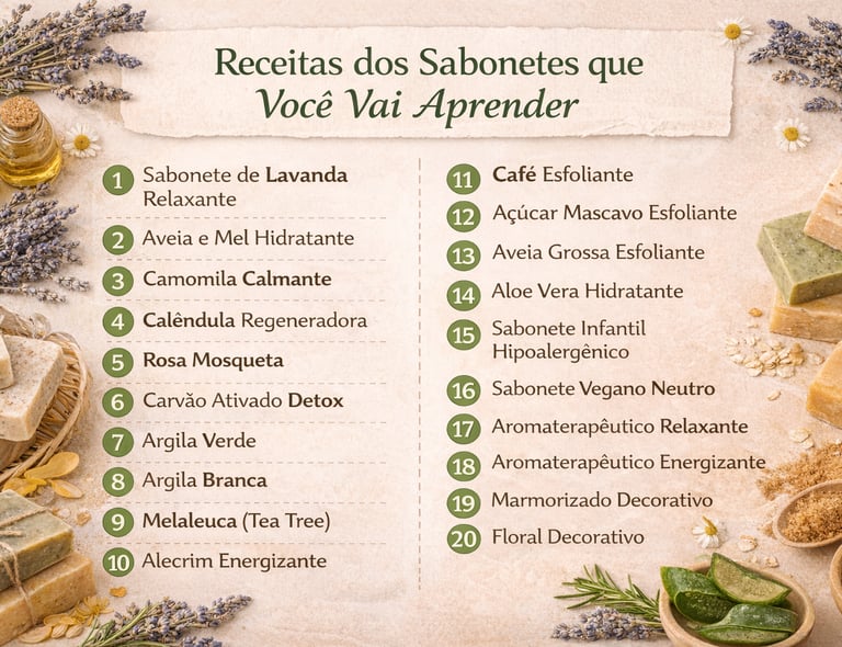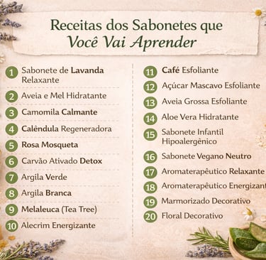 O Método Saboaria Artesanal é um passo a passo prático e validado que ensina qualquer pessoa, mesmo sem experiência, a produzir sabonetes artesanais de alta qualidade, com receitas exatas, técnicas profissionais e foco nos tipos mais vendidos do mercado.